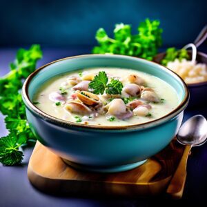 New England clam chowder is known for its hearty, creamy base, made with milk or cream, and often thickened with potatoes and a roux, introduced in New England by French, Nova Scotian, or British settlers in the 1700s. It is also known as Boston Clam Chowder.